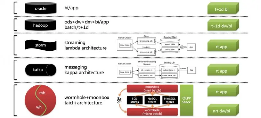 图8给出了数据处理架构的演化,和OLPP的一种架构模式。其中wormhole和moonbox分别是我们开源的流式处理平台和计算服务平台,后面会具体介绍。
