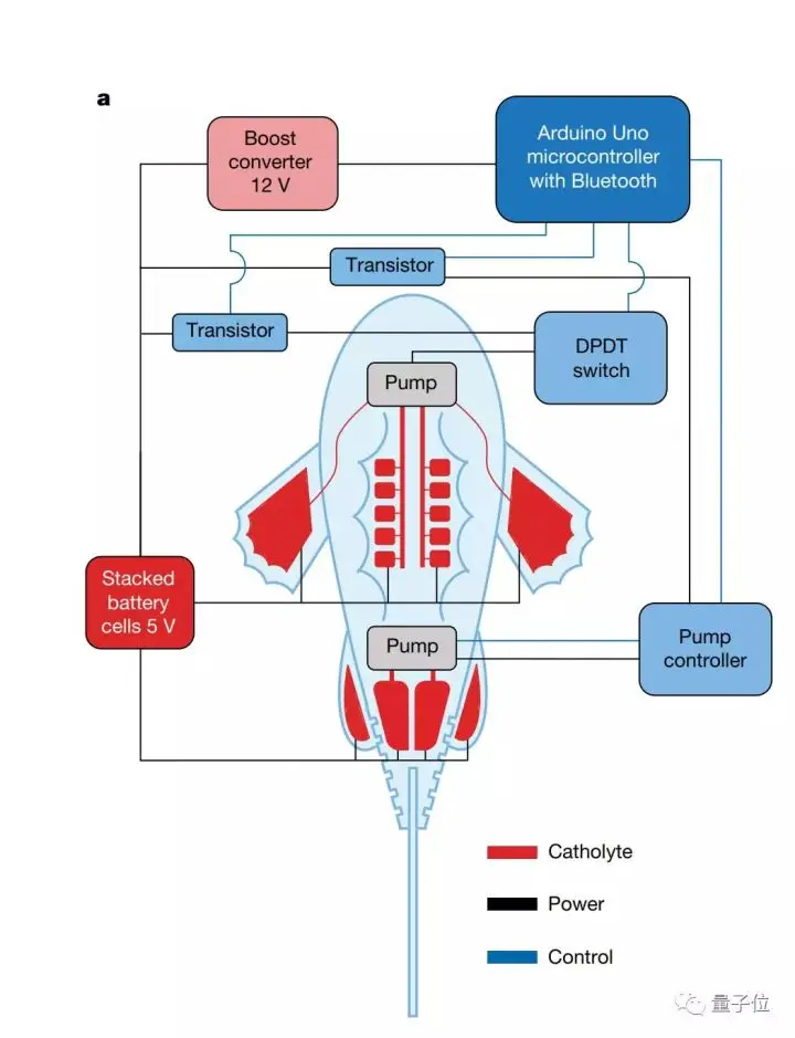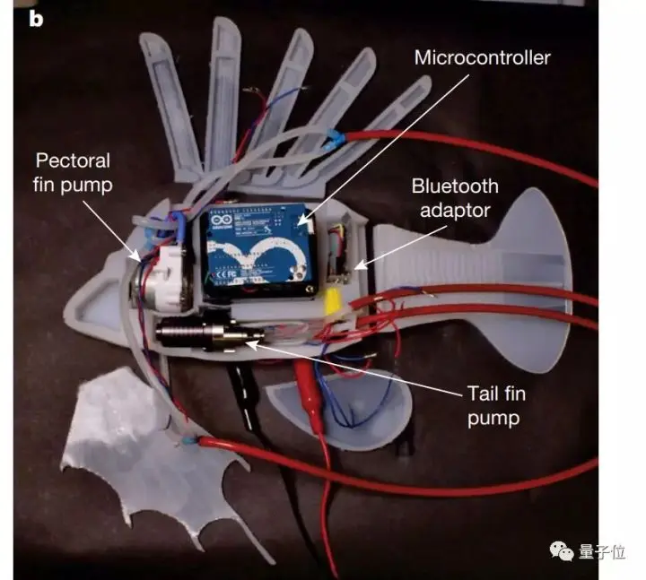 电子会流过为泵供能的电子元件,泵一开始工作,鱼鳍便可以动起来了。