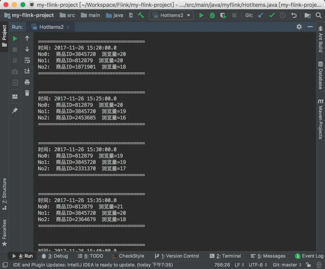 直接运行 main 函数,就能看到不断输出的每个时间点的热门商品ID。