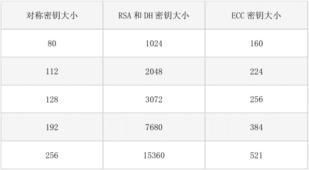 ECC椭圆加密算术相比普通的离散对数计算速度性能要强很多。下表是NIST推荐的密钥长度对照表。