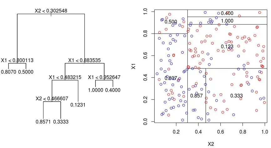 对于每个真/假的答案,都有单独的分支。无论问题的答案如何,我们最终都会实现一个预测(叶节点)。从顶部的根节点开始,然后在树中继续回答问题。所以给出任何一对X1,X2。
