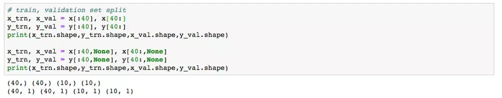 # train, validation set splitx_trn, x_val = x[:40,None], x[40:,None]y_trn, y_val = y[:40,None], y[40:,None]# fit a modelm = DecisionTreeRegressor(max_depth=6).fit(x_trn, y_trn)请注意,决策树回归器期望二维数组,而不是二维数组中的一维数组。