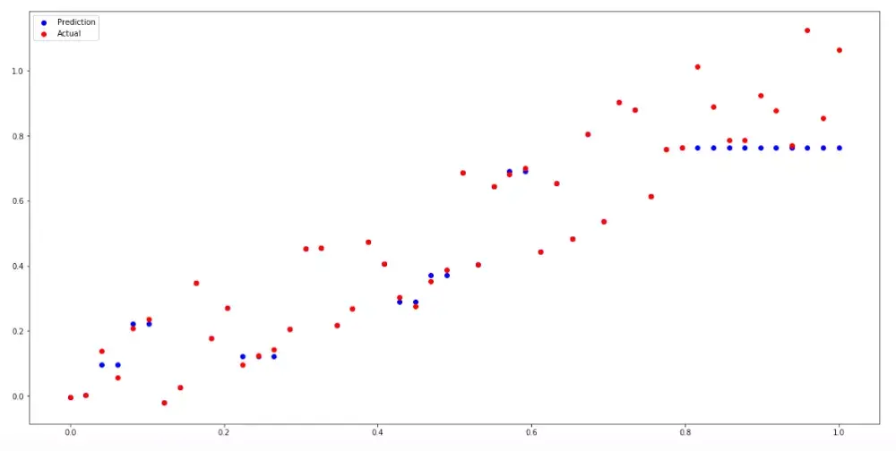 plt.scatter(x_val,m.predict(x_val),color='blue',label='Prediction') plt.scatter(x_val,y_val,color='red',label='Actual') plt.scatter(x_trn,m.predict(x_trn),color='blue') plt.scatter(x_trn,y_trn,color='red') plt.legend(loc='upper left')如果您不知道决策树如何工作,那么这将使模型无用。换句话说,决策树和基于树的模型通常无法推断出他们以前从未见过的任何类型的数据,特别是未来的时间段,因为它只是平均它已经看到的数据。