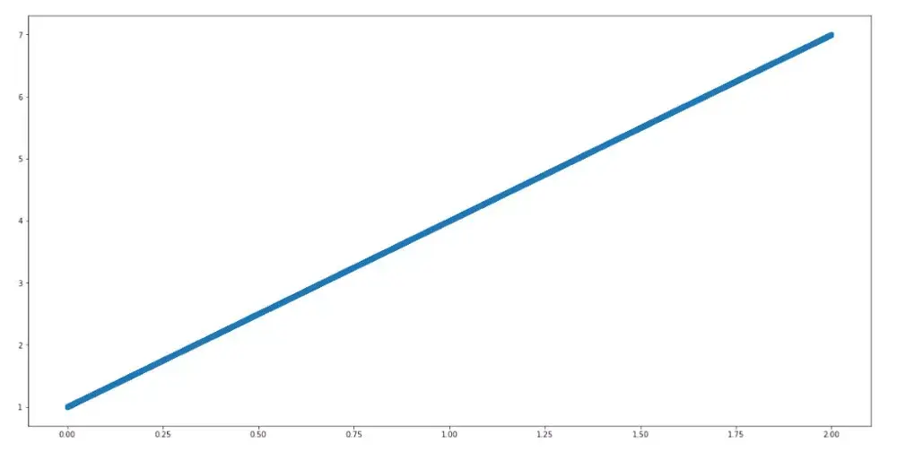 import numpy as npimport matplotlib.pyplot as pltfrom sklearn.tree import DecisionTreeRegressorfrom sklearn.linear_model import LinearRegressionplt.figure(figsize=(20,10))x = np.linspace(0,2,10000)y = 1+ 3*xplt.scatter(x,y)我们现在要构建决策树和线性模型。我们期望线性模型完美拟合,因为目标变量与特征x线性相关。因此,我将对数据进行无序处理,将70%视为训练集,将30%视为验证。