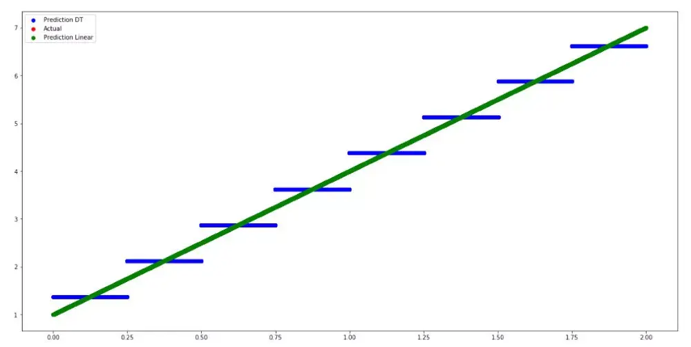 plt.figure(figsize=(20,10))plt.scatter(x,dt.predict(x[:,None]),color='blue',label='Prediction DT')plt.scatter(x,l.predict(x[:,None]),color='green',label='Prediction Linear')plt.scatter(x,y,color='red',label='Actual')plt.legend(loc='upper left')在某种程度上,决策树试图适应 staircase。显然,在这种情况下,线性模型运行得很好,但在目标变量与输入特征不线性相关的其他情况下,DT将是更好的选择,因为它能够捕获非线性。另请参阅以下SciKit学习文档中的另一个示例: