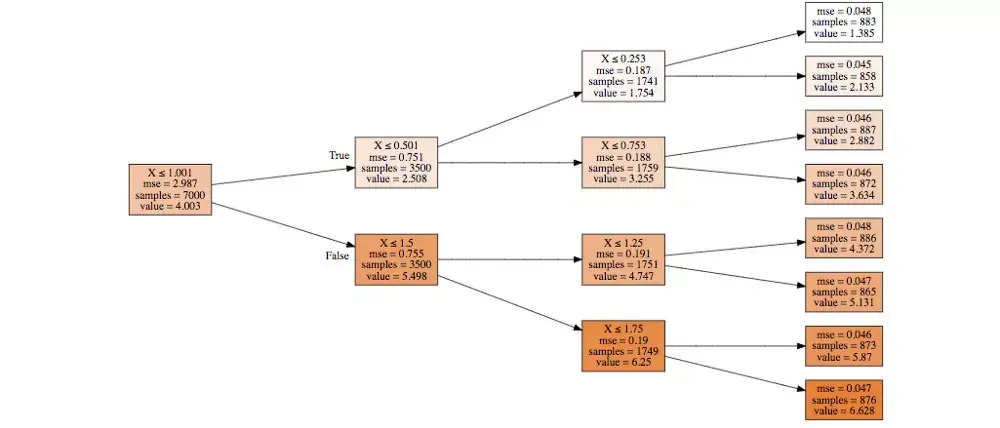 def draw_tree(t, col_names, size=9, ratio=0.5, precision=3): """ Draws a representation of a random forest in IPython. Parameters: ----------- t: The tree you wish to draw df: The data used to train the tree. This is used to get the names of the features. """ s=export_graphviz(t, out_file=None, feature_names=col_names, filled=True, special_characters=True, rotate=True, precision=precision) IPython.display.display(graphviz.Source(re.sub('Tree {', f'Tree {{ size={size}; ratio={ratio}',s)))col_names =['X']draw_tree(dt, col_names, precision=3)如您所见,我们正在获取数据的子集,并决定进一步划分子集的最佳方式。我们的初始子集是整个数据集,我们根据规则对其进行拆分X<=1.001。然后,对于每个子集,我们执行额外的拆分,直到我们能够正确地预测目标变量,同时遵守约束max_depth=3。
