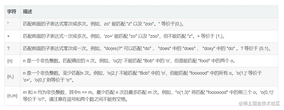 限定符用来指定正则表达式的一个给定组件必须要出现多少次才能满足匹配。有 * 或 + 或 ? 或 {n} 或 {n,} 或 {n,m} 共6种。