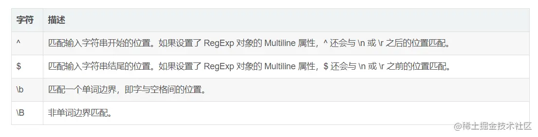 定位符用来描述字符串或单词的边界,^ 和 $ 分别指字符串的开始与结束,\b 描述单词的前或后边界,\B 表示非单词边界。