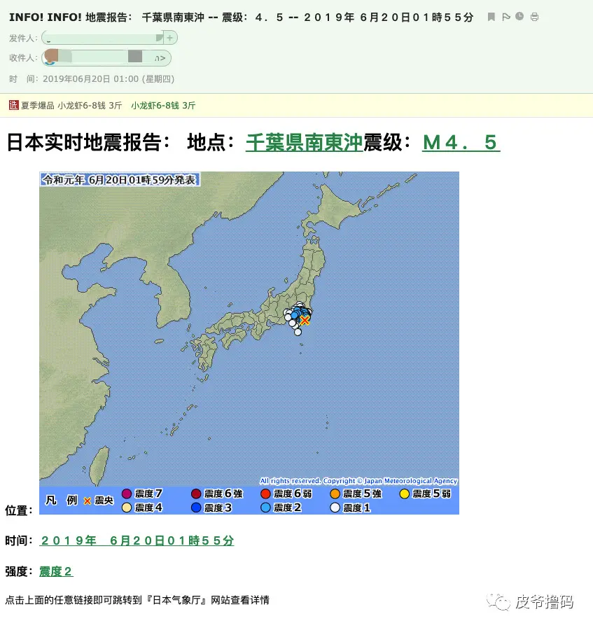 最后实际效果就是,如果一旦发生地震比较严重,我的邮箱里面就会收到一封服务器自动发送的邮件: