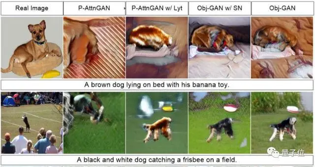 ObjGAN能生成多种场景下的小狗:一只棕色小狗躺在床上,或者是一只黑色小狗叼飞盘。