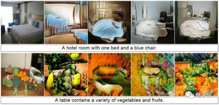 上一张是酒店房间,下一张是多种蔬菜水果,这两种场景下的对象非常多,P-AttnGAN已经翻车,除了画面混乱外,它还发生了理解错误的问题,把蓝色属性错误地放在床这个物体上。