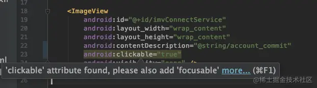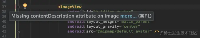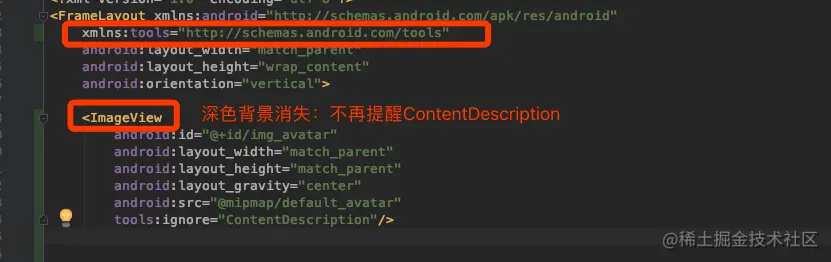 - 其次,如果一个非文本Widget在用户界面上只是一个装饰,不展示任何内容也不接受任何用户操作,就不需要给它提供描述性的contentDescription属性文本,而是使用tool属性tools:ignore="ContentDescription"抑制lint提醒。
