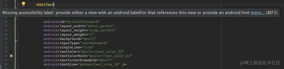缺少可访问标签:可编辑的控件例如EditText应该为hint属性赋值,或者在minSDKVersion大于等于17时,使用labelFor属性为EditText指定一个标签控件。标签控件可以是指定了text属性的文字控件如TextView,也可以是指定了contentDescription的非文字控件如ImageView。
