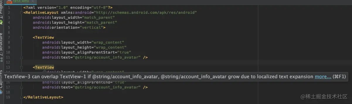 在API 17或更高版本上使用RTL属性需要在manifest文件的application标签中设置android:supportsRtl="true"。如果已经开始在layout文件中加入RTL属性,但是没有完全使用RTL替代旧版的属性设置,可以设置android:supportsRtl="false"规避lint的检查。