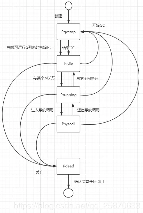 P的初始状态就是为Pgcstop,处于这个状态很短暂,在初始化和填充P中的G队列之后,运行时系统会将其状态置为Pidle并放入调度器的空闲P列表 (runtime.sched.pidle)中。其中的P会由调度器根据实际情况进行取用。下图是P在各个状态建的流转情况: