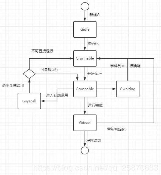 正在被初始化进行中的G是处于Grunnable状态的。一个G真正被使用是在状态为Grunnable之后。G的生命周期及状态变化如图: