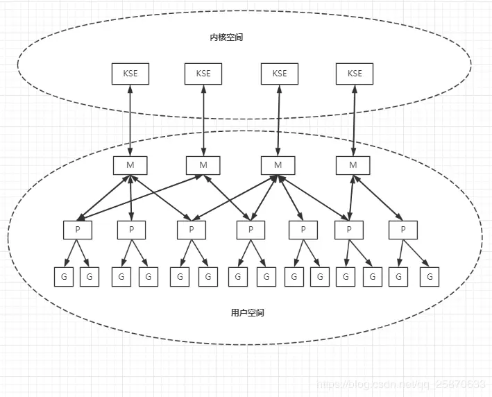 由上图可以看出 M 与 KSE 总是 一对一 的。一个M能且仅能代表一个内核线程。 一个M的生命周期内,它会且仅会与一个KSE产生关联。