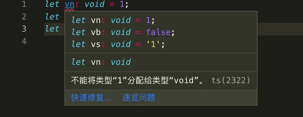 总结下,只能将 undefined、null 和没有返回值的函数赋值给 void(空值)类型。