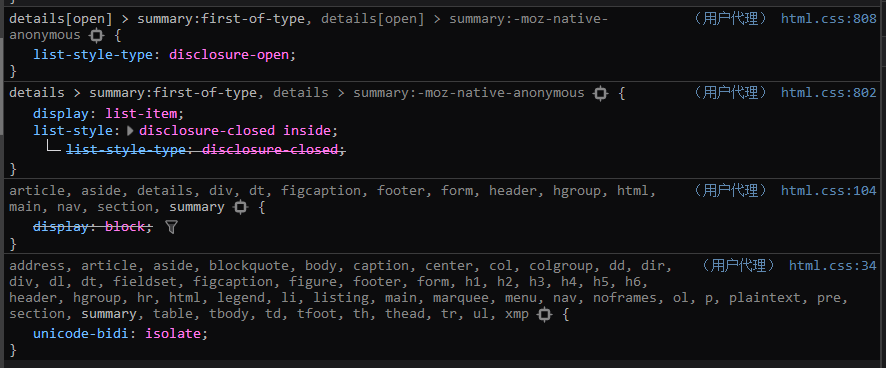 Firefox 使用的是 Gecko 引擎,与 Webkit 不同。如果我们调出 Firefox 的控制台,查看 summary 使用的用户代理就会发现,它是直接将 summary 元素设置成 list-item 元素,展示那个箭头的。