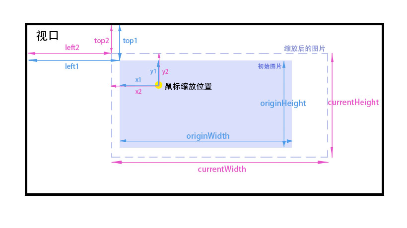 相比于图片拖拽,图片缩放原理稍微复杂一点,我在上图把一些关键的数据都标注出来了,我们可以对照图来分析: