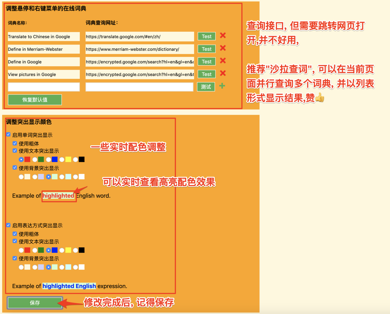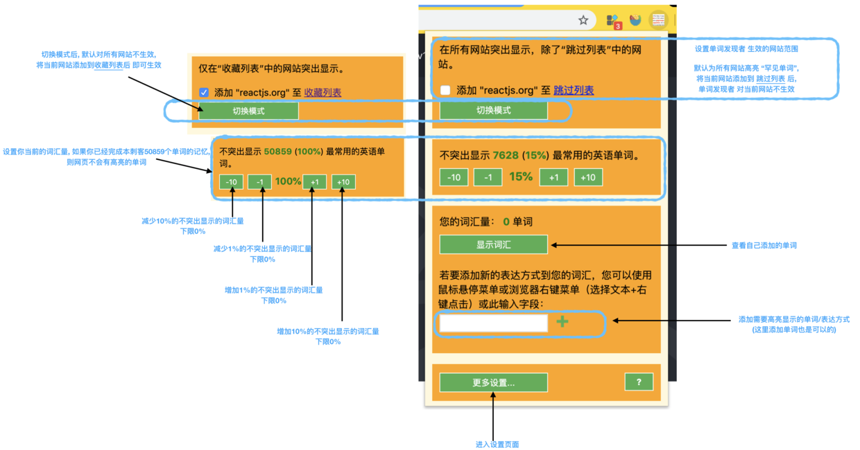 通过自动高亮网页单词, 辅助单词记忆是一个很好的路子, 建议过一段时间,就稍微调高不突出显示 最常用的英语单词的数量, 比如从默认的15%调整到16%, 单词发现者与沙拉查词结合使用, 真的是体验极佳~