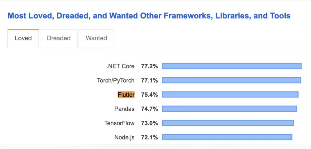 要说2019年前端最火的技术,那就非flutter莫属。在 StackOverflow 2019 年的全球开发者问卷调查中,Flutter 被选为最受开发者欢迎的框架之一,超过了 TensorFlow 和 Node.js。