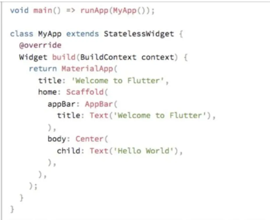 Flutter是由谷歌开发的 Flutter 提出了一种名为 Dart 的新编程语言。但是对于前端js开发者会比较陌生,而对于那些具有 OOP 语言经验的人,比如 C ++ 和 JAVA,可以很容易地学习编码。以下是hello world项目的Flutter实现。由于 Dart 没有模板、样式和数据文件的分离。因此,代码变得有点难以理解