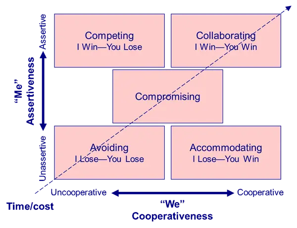 A simple Conflict Resolution Matrix illustrates this approach (adapted from here). Our stance is neither Competing (Agile wins) nor Accommodating (Agile loses) but Collaborating (the business
