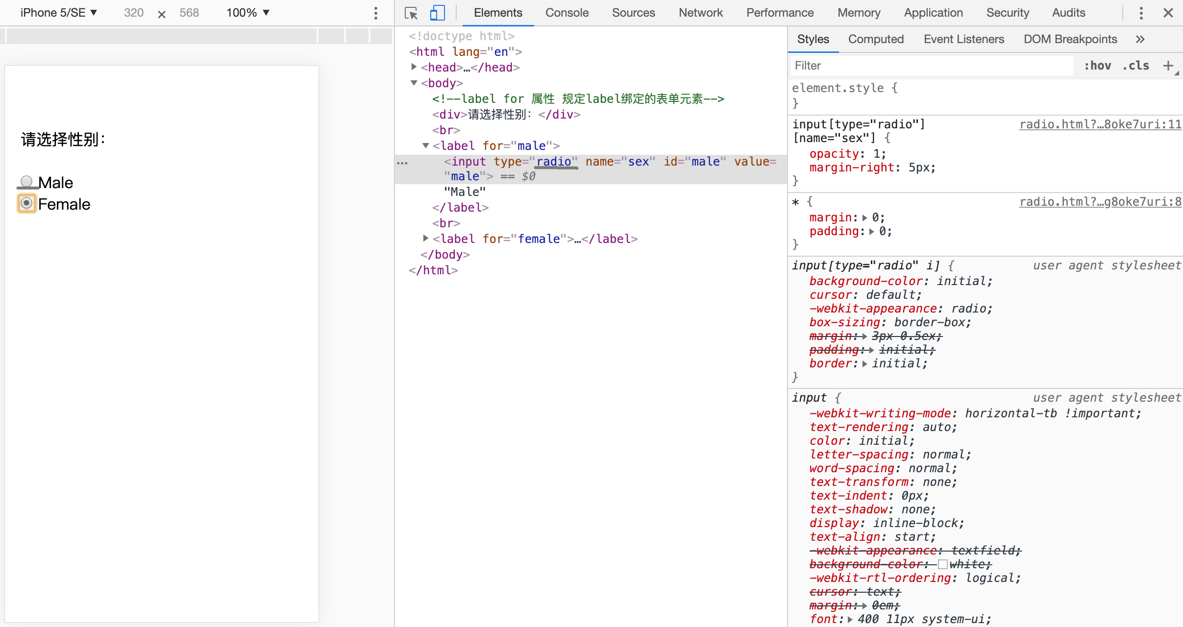 <label for="female"><input type="radio" name="sex" id="female" value="female"><span></span>Female</label>