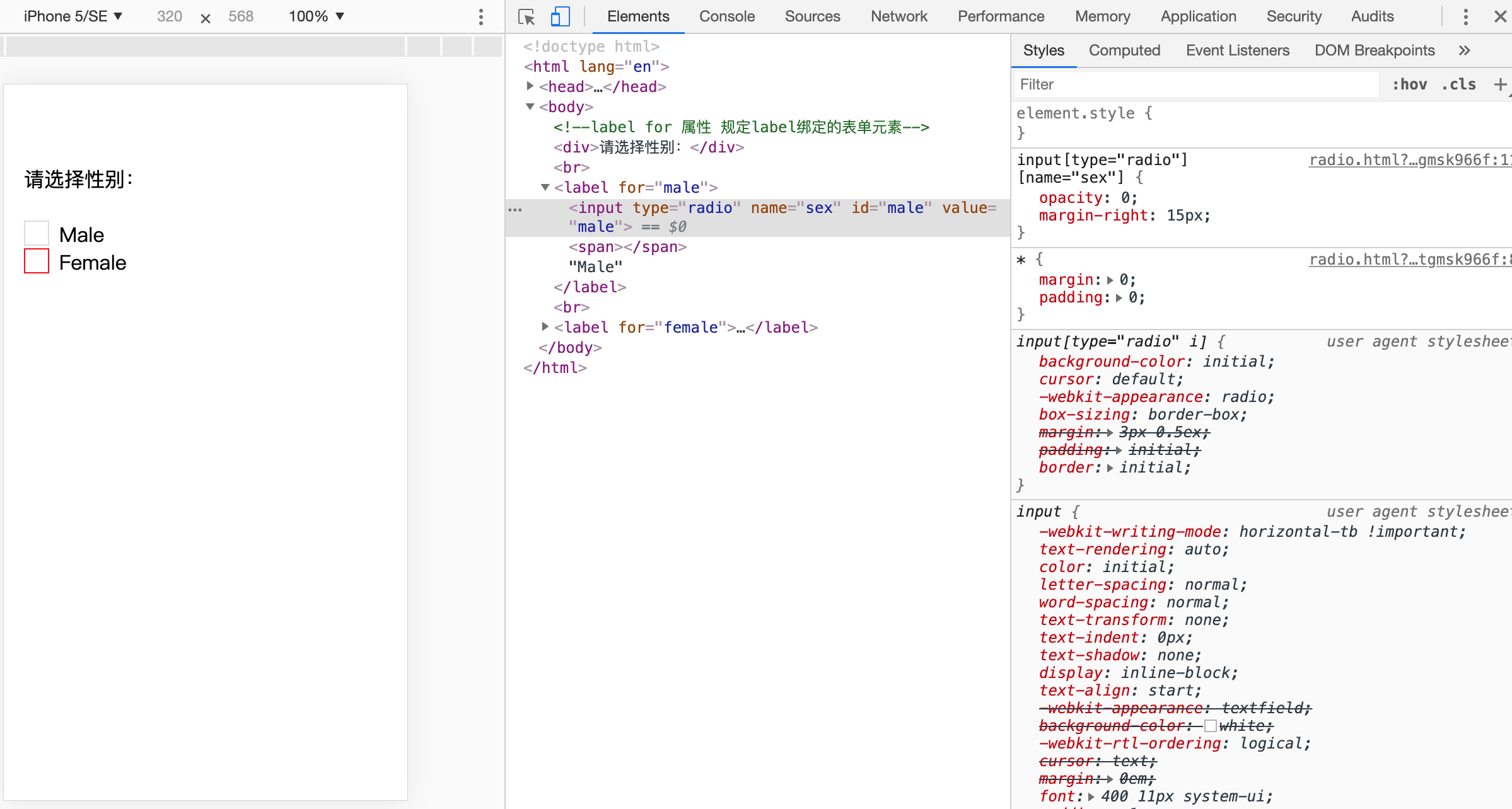 <label for="male"><input type="radio" name="sex" id="male" value="male"><span></span>Male</label>