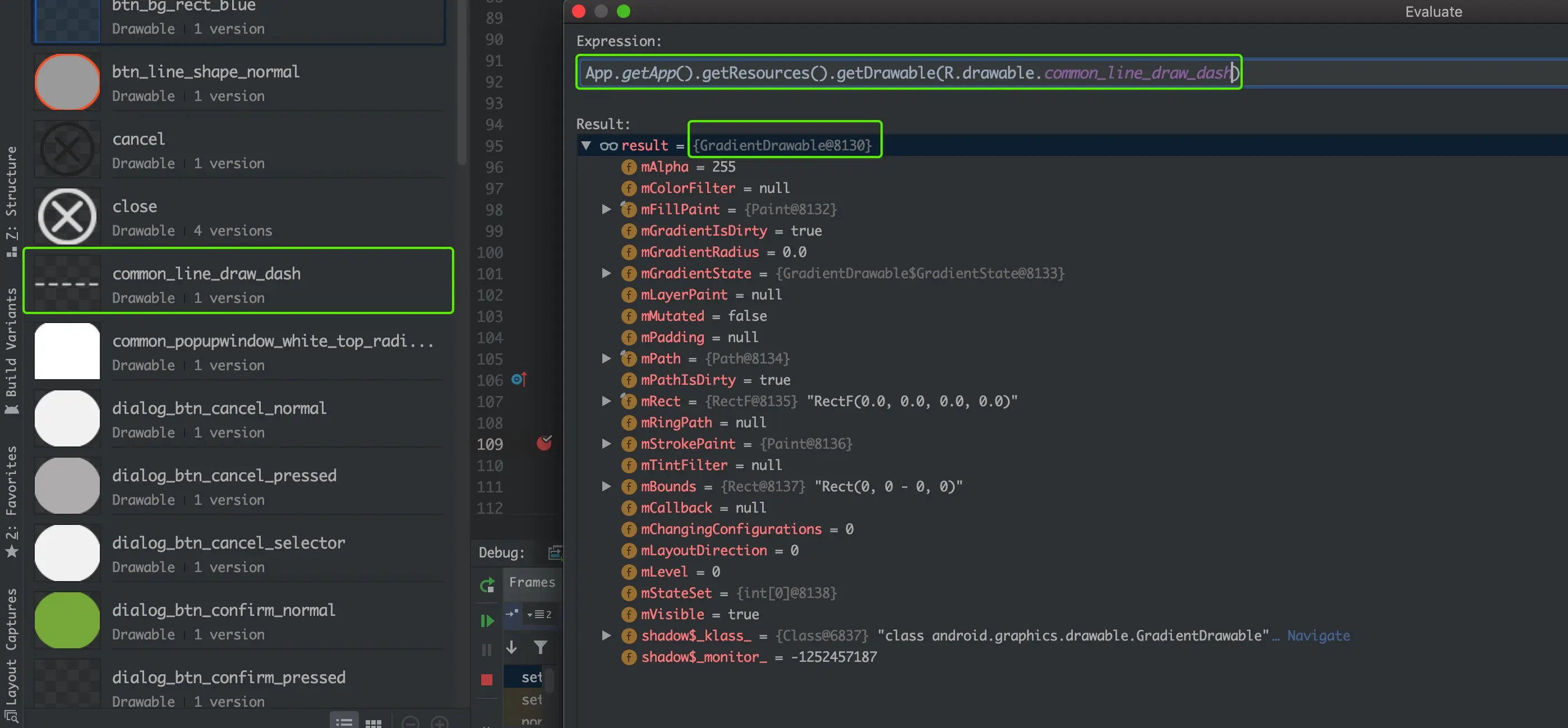 看到background.draw(canvas)方法时,你可能想问我怎么知道这个虚线xml文件,最后实例化之后的Drawble对象对应的GradientDrawble的对象。看下面这张图,你就明白了: