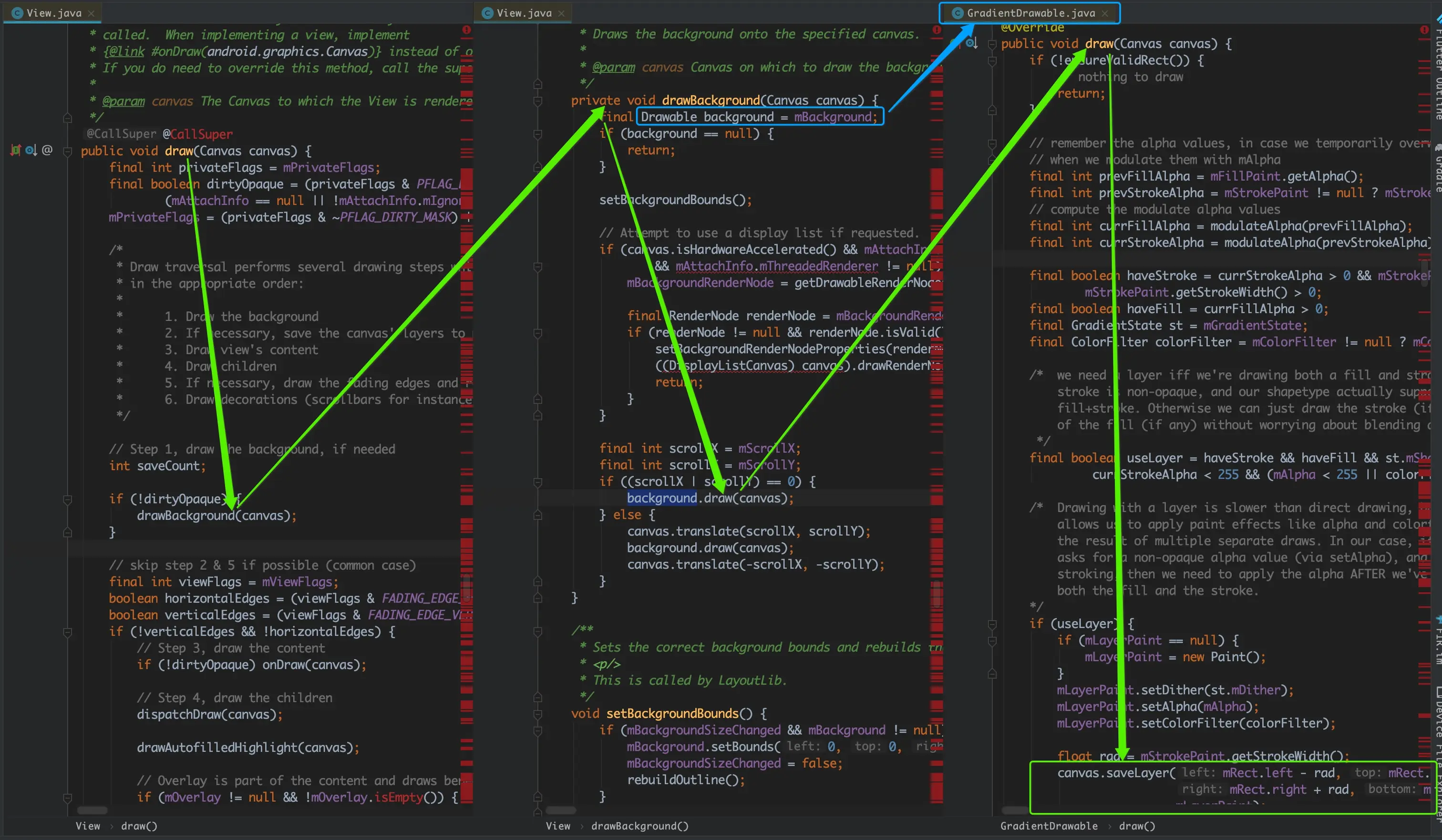 既然这样我们就需要重新去须按照其他的证据来证明View在画虚线时,无法使用硬件加速,虽然上面图中找到的saveLayer方法不能证明是需要关闭硬件加速的原因。但是这个View绘制背景的流程是没有问题的,并且我们知道用标签定义的xml文件在膨胀后得到的是一个GradientDrawable对象。