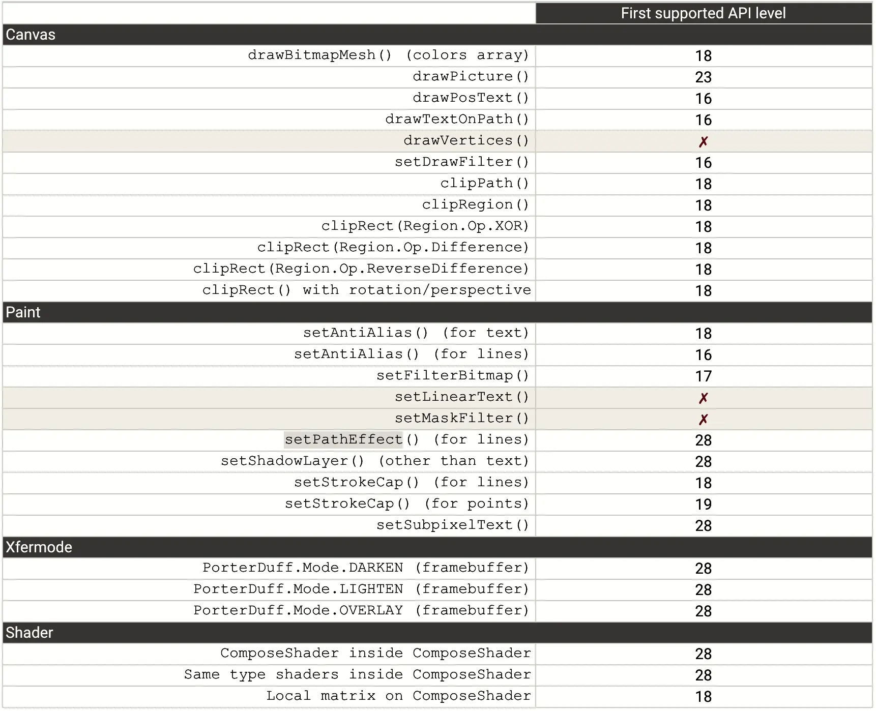 到这里一切都水落石出了。之所以虚线会在大部分手机上绘制成实现是因为就是因为Paint的setPathEffect()方法不支持硬件加速。其实通过上表可以看到,在Android 9(API级别28)以后,就可以不用关闭硬件加速也可以绘制XML定义的虚线了。
