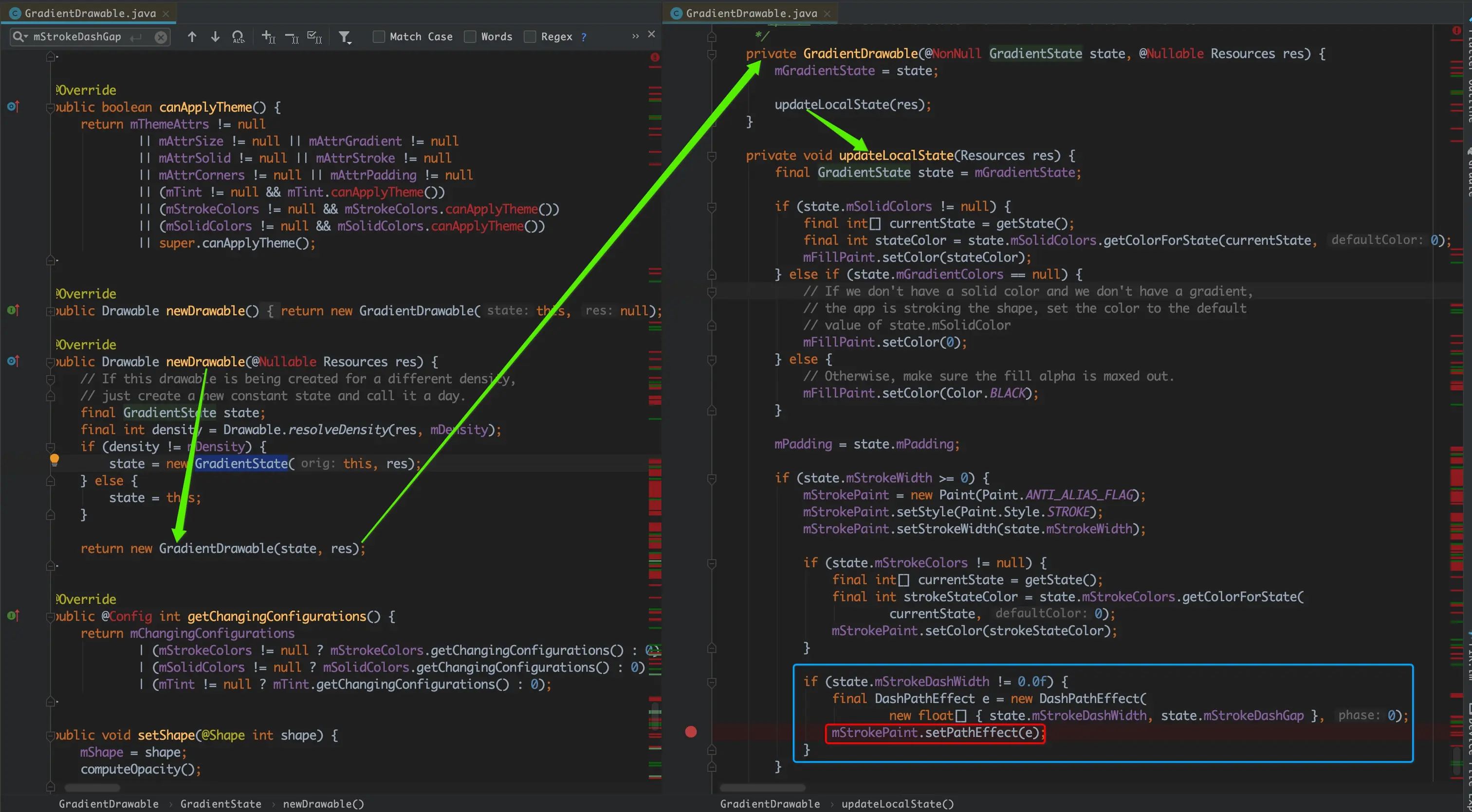 既然前面我们已经知道用标签定义的虚线XML文件膨胀后是一个GradientDrawable对象。那么GradientDrawable也应该有自己的ConstantState内部类。点进GradientDrawable的源码拉到底部,果然就看到了一个继承自ConstantState的GradientState类。借着又是一招顺藤摸瓜: