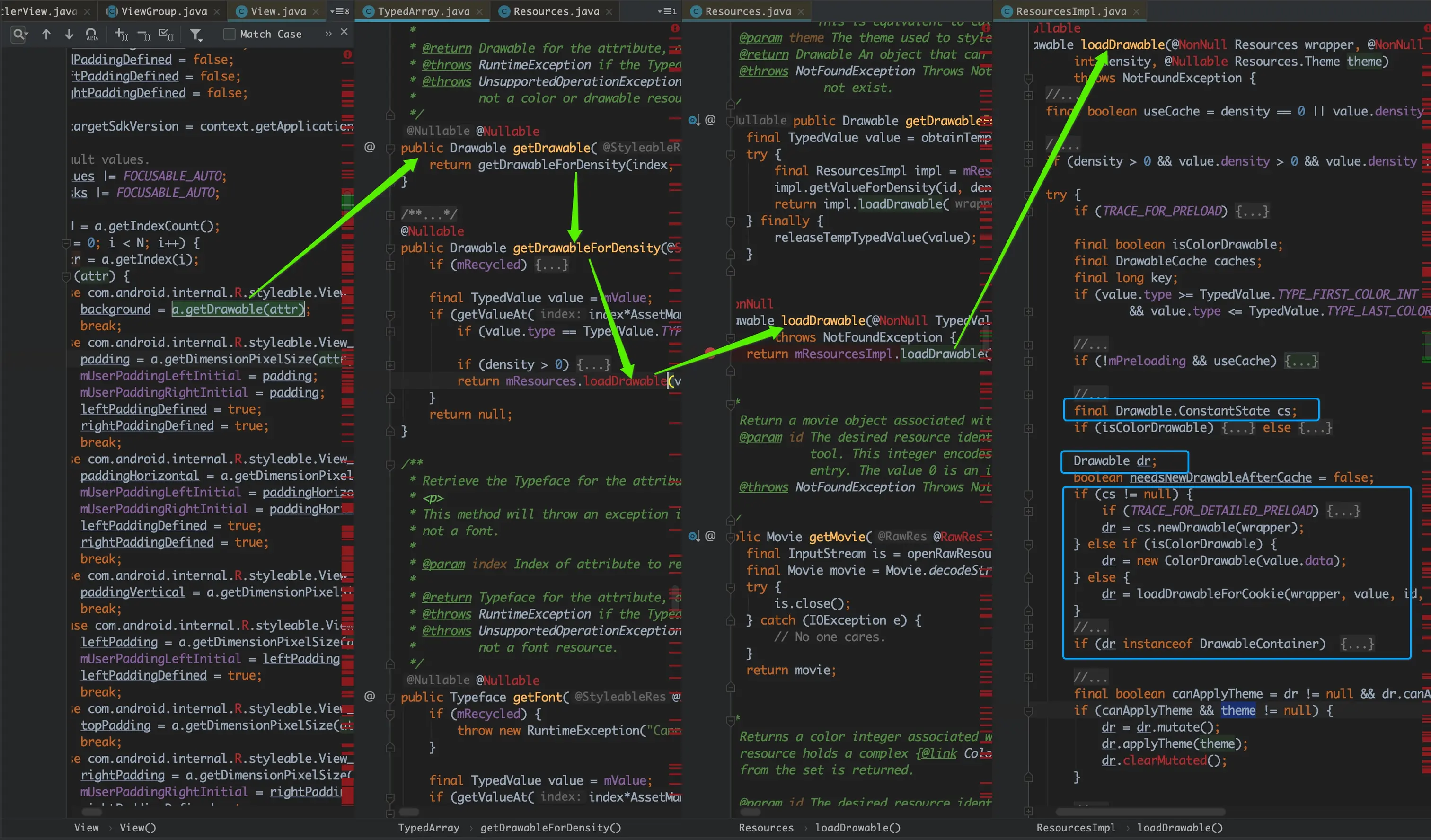 然后大概可以看明白当cs不为null时,Drawable是通过cs.newDrawable()方法生成的。cs在上面代码中的第一行已经定义了,它是一个Drawable的静态内部类Drawable.ConstantState;