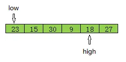 第一个位置的值23作为基准值base,从右边开始比较,如果arr[high]>base,high前移。