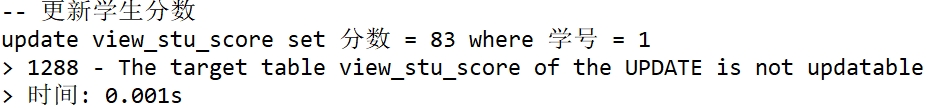 - update view_stu_score set 分数 = 83 where 学号 = 1;
