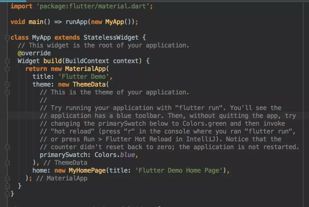 和其他语言一样,dart通过main()函数开始执行所有的逻辑,这里main函数创建了一个叫MyApp的对象,他是一个Widget,在Flutter世界里,所有的界面元素都是Widget,类似于Android中的View。