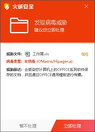 【快讯】火绒安全团队发出警告,近日,一批新型宏病毒正通过Excel文件传播,该病毒入侵电脑运行后,会悄悄访问带有推广计费名的2345网址暗刷流量,并且还会感染电脑上其它的Excel文件,然后通过这些文件传播给其它电脑,被感染的Excel文件打开后会出现“安全警告 宏已被禁用”的提示。