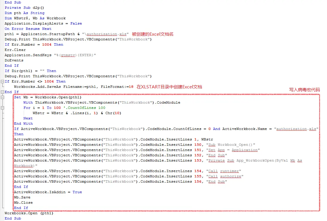 病毒感染相关代码执行后,会先在XLSTART目录下创建名为authorization.xls的Excel文档,并将病毒代码前100行插入到该文档的宏模块中,之后续追加的病毒函数调用代码,使authorization.xls主要为用来感染其他Excel文档。authorization.xls被创建后,所有被启动的Excel文档都会加载执行该宏病毒代码。相关代码,如下图所示: