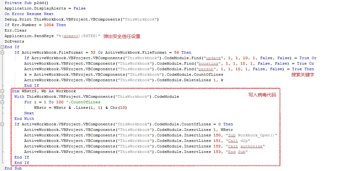 当有其他Excel文档被打开时,如果当前文档ThisWorkbook宏模块前10行中存在“update”、“boosting”、“person”关键字,则会将ThisWorkbook宏模块中的原始代码删除,删除行数与病毒代码行数相同。之后,将病毒宏代码前100行插入到ThisWorkbook宏模块中,再加入相关调用代码。被追加的调用代码决定被感染的Excel主要会释放authorization.xls、暗刷流量。相关代码,如下图所示: