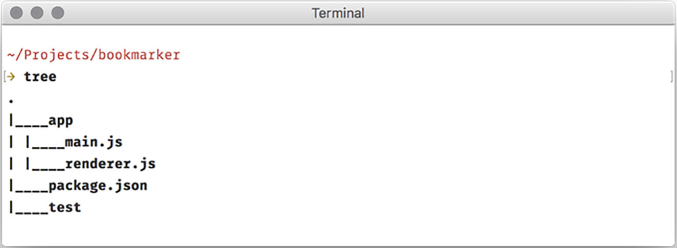 就文件而言,让我们从应用程序中的两个文件开始:main.js和renderer.js。它们是带有标识的文件名,因此我们可以跟踪这两种类型的进程。我们在本书中构建的所有应用程序的开始大致遵循图2.2中所示的目录结构。(如果你在运行macOS,你可以通过安装brew install tree使用tree命令。)