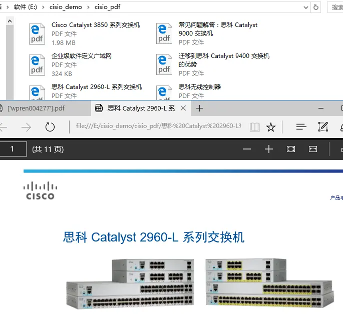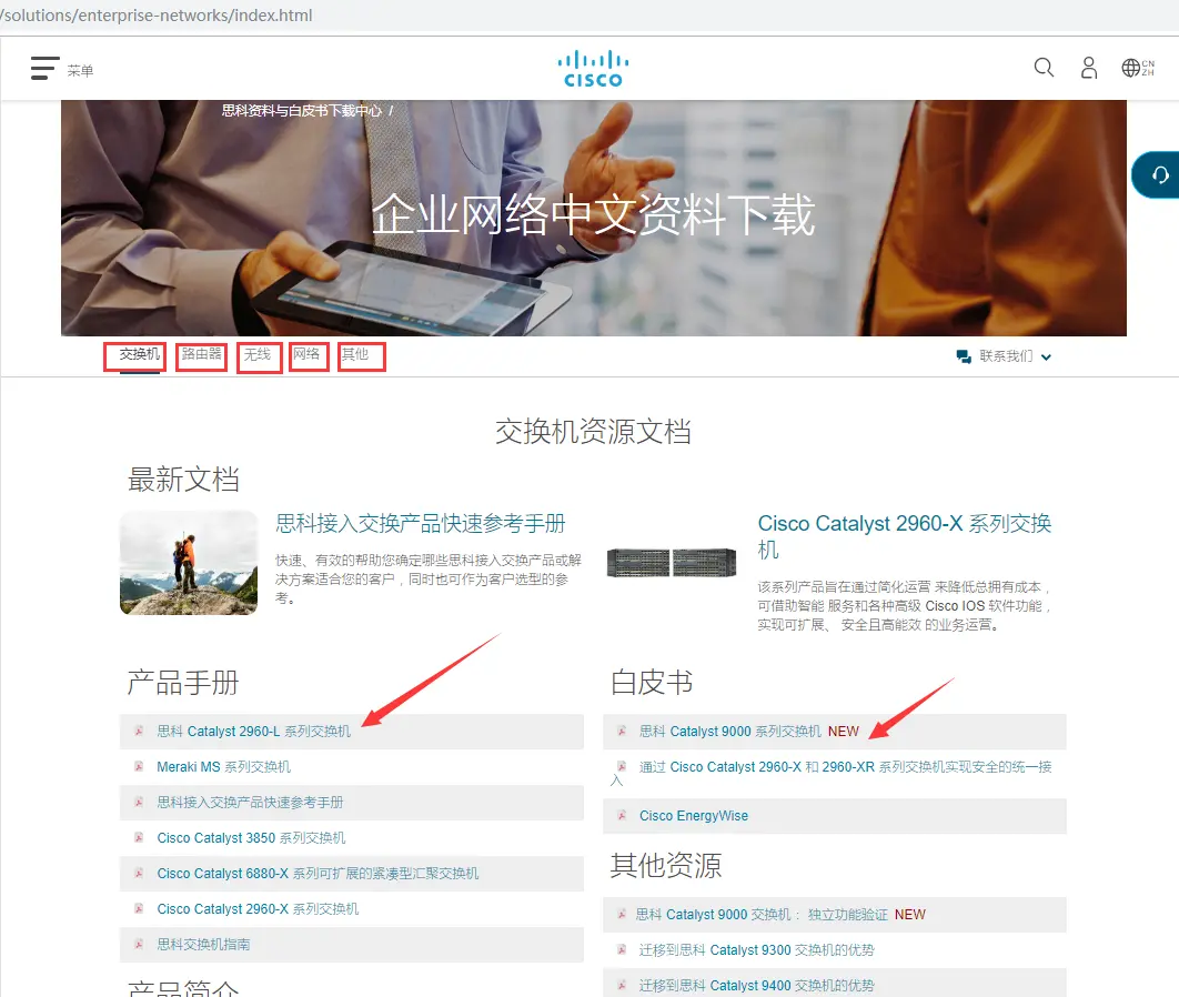 一般而言,我们要抓取的数据不必要从一个网站的首页开始,定位到数据存在的子页面直接抓取会更加方便,思科官网是英文的不方便我们分析,转换为中文页面,然后对官网层层嵌入查找,找到我们需要的抓取的企业网络资料页如下图所示,然后抓取交换机、路由器、无线、网络以及其它这些标签下的所有pdf文件(所有文件均为pdf格式存在)