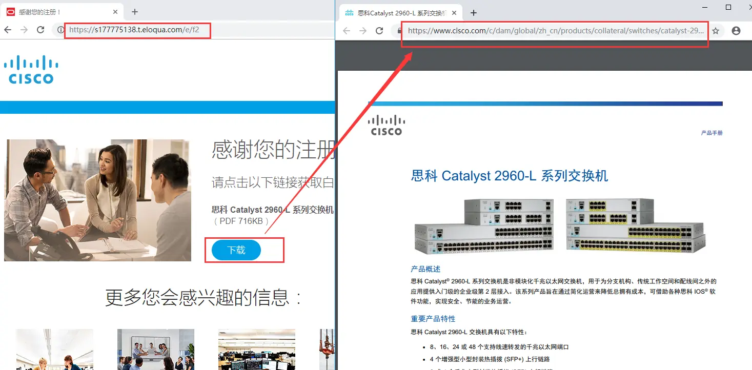 另外一个有意思的点在于注册完点击下载后,不是直接将pdf文件下载下来,而是又跳到一个新的下载页面,在之前页面的页面控制台下也找不到和这个URL相关的信息,这个URL和pdf文件的URL似乎也没有半毛钱关系,因为不提供登录方法,无法维持自己客户机与思科服务器之间的连接,所以当再次访问上面的下载页面链接‘s177775138.t.eloqua.com/e/f2’时直接报错。