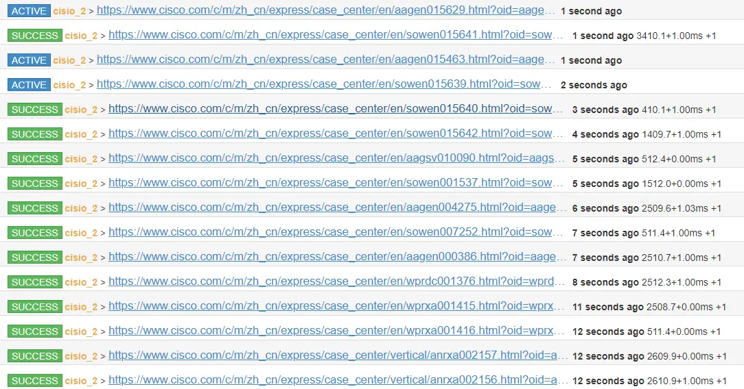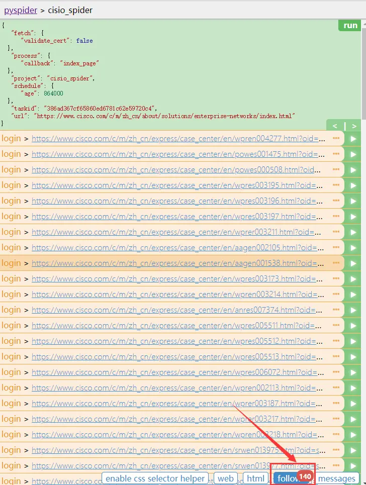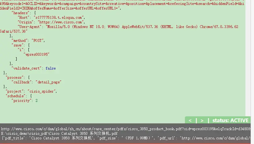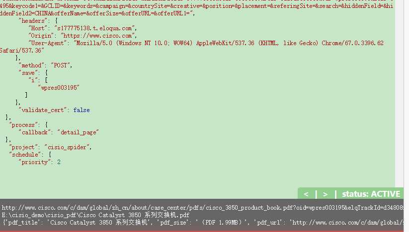 可以看出,pyspider这个框架还是挺好用的,三个函数,几十行代码即可抓取到思科官网的资料,虽然需要频繁注册,但这对于分布式的pyspider框架而言,自己本身的特点就是快,写好抓取和解析规则后,无惧这类频繁注册的网站。