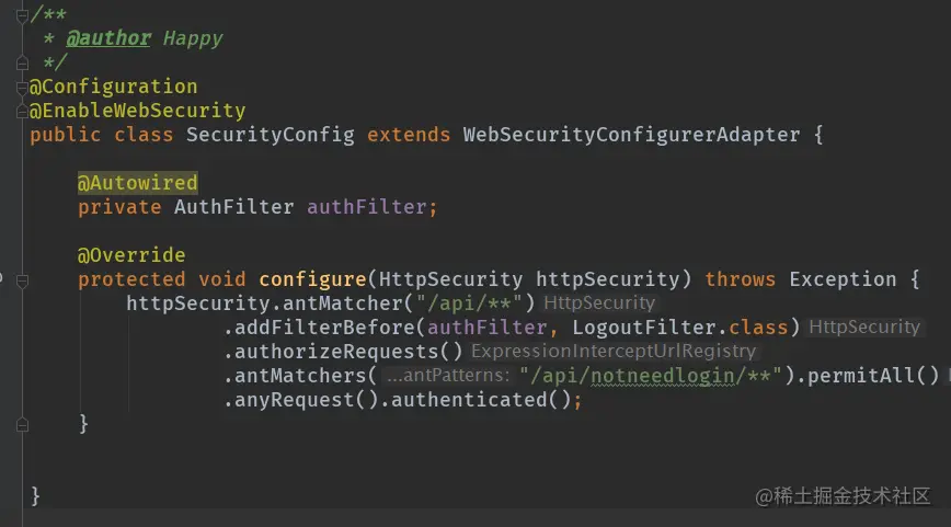 本文讲解了使用Spring Security来做鉴权框架,Spring Security配置起来还是挺繁琐的,但是配置完成之后,后续的获取上下文用户注解什么的,是真的方便。我把代码放到GitHub上,方便大家下载直接复制使用,地址如下:github.com/happyjava00…