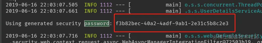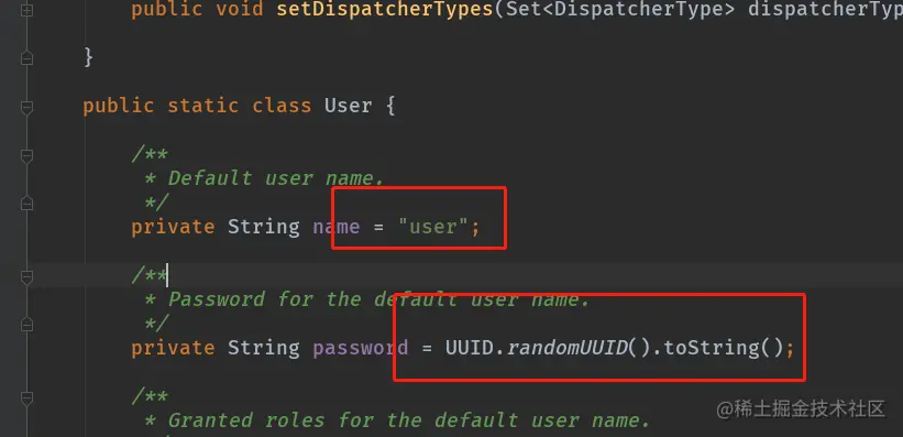 我们可以通过SecurityProperties的源码查看,其默认账号是user,密码是启动的时候随机生成的,可以在日志里找到: