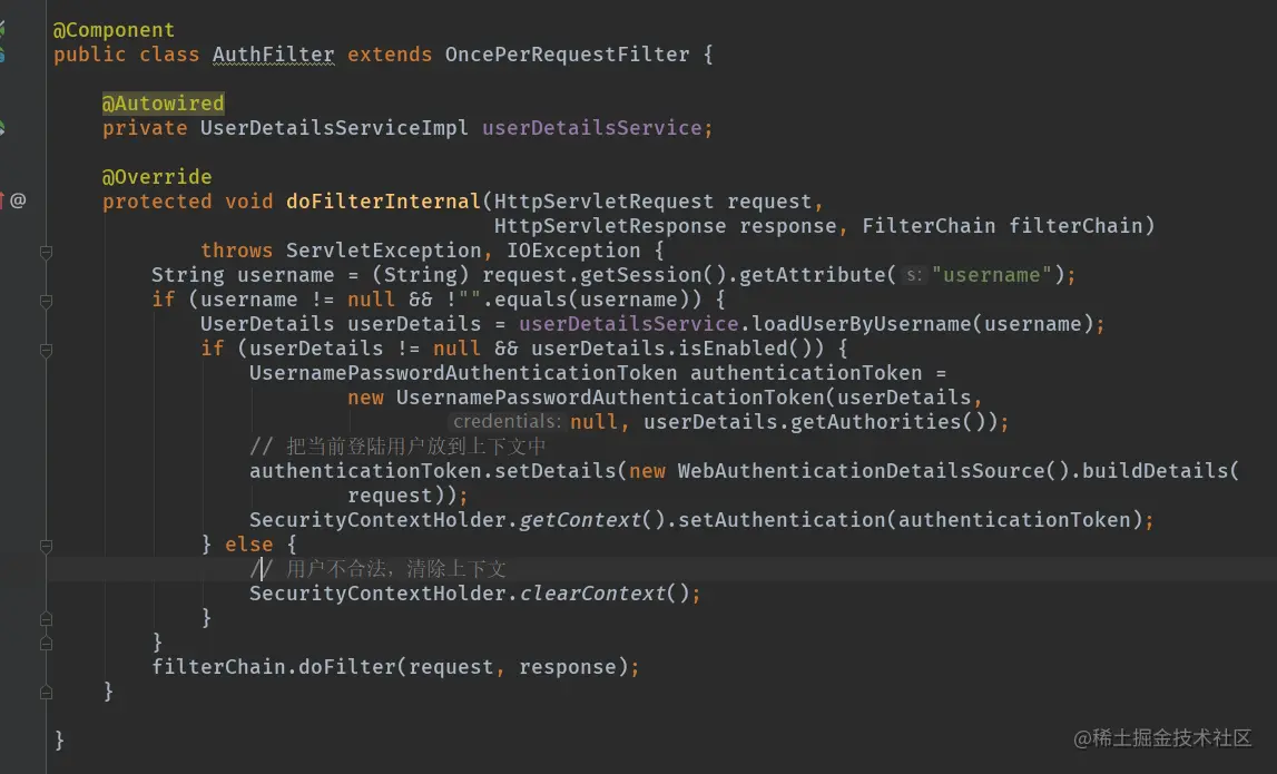 其次,我们还需要一个过滤器,拦截请求判断是否登陆,组装UserDetails: