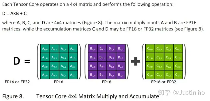tensor core最早出现在nvidia的volta架构,用于加速深度学习经常需要的矩阵运算。当使用tensor core时,我们需要从以往的单精度运算(float32)转换成为混合精度(float16+float32)计算,而tensor core正是能加速这些混合精度运算。所谓“混合精度-mix precision”,如下图,假设A和B是FP16精度的矩阵,矩阵相乘后再和一个FP16或者FP32精度的矩阵相加,会得到一个FP16或者FP32的矩阵(取决于你相加的矩阵是什么精度)。
