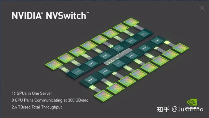 nvidia官网介绍视频的这两张图很好地介绍了两者之间的区别。下图一个主板上的8块GPU通过6块nvswitch芯片与另一块主板上的任意一块GPU进行通信,使得8对GPU能够同时以300GB/s的速度进行通信,实现16个GPU全连接。除此之外,nvswitch还能使得整个服务器作为一块拥有0.5TB显存、2PetaFLOPS算力的“大显卡”使用。